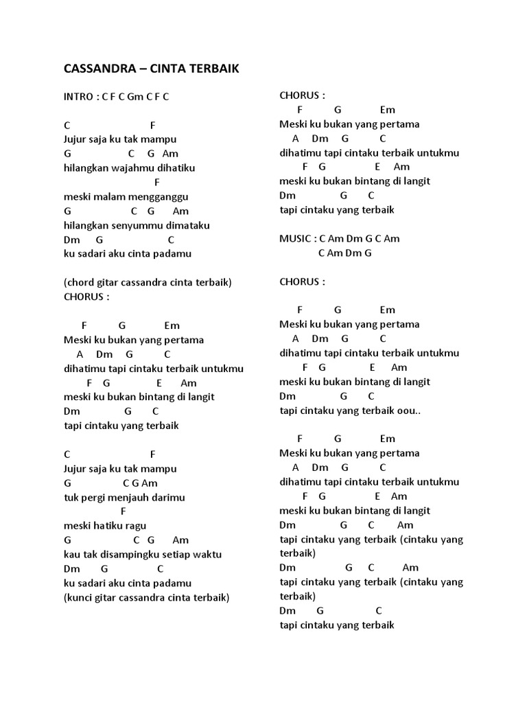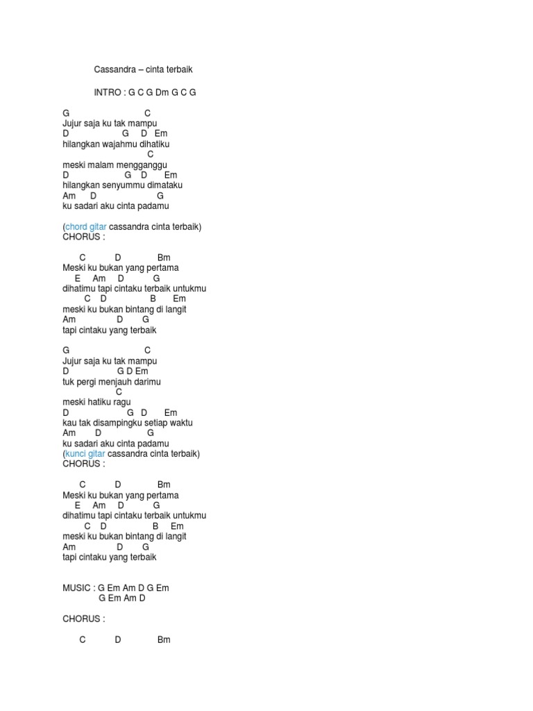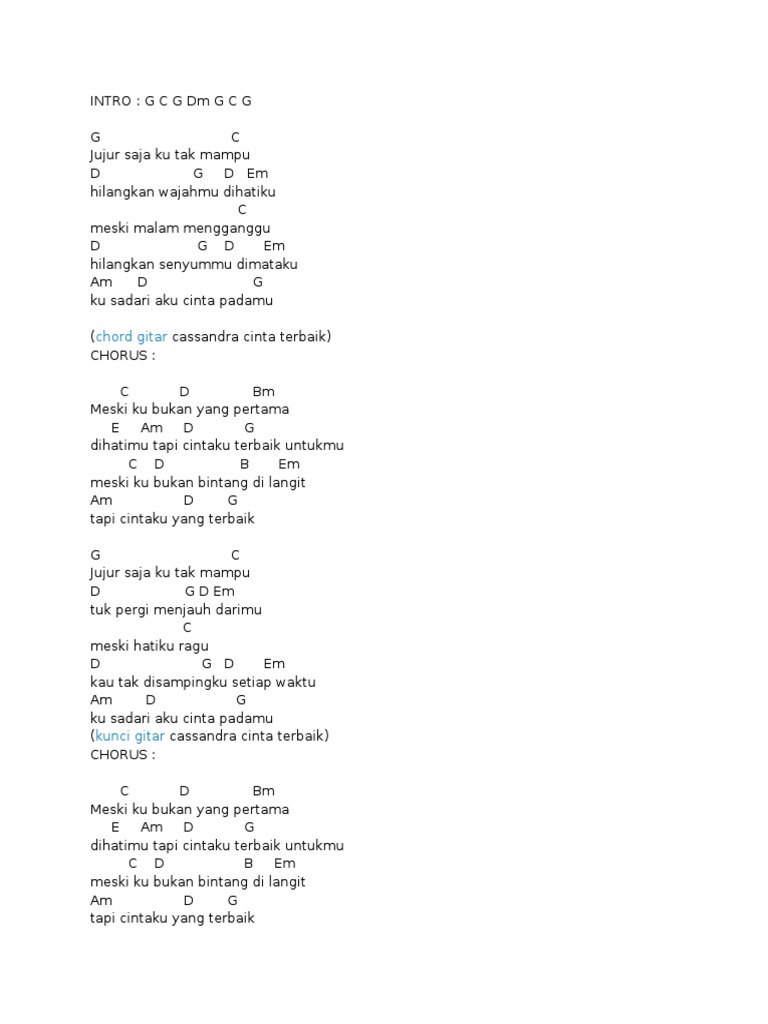 Capo di fret 1 Intro G C G D G C G D G C jujur saja ku tak mampu. Penempatan kunci gitar Cassandra Cinta Terbaik di bawah saya taruh persis di atas lirik pada waktu perpindahan chordnya.