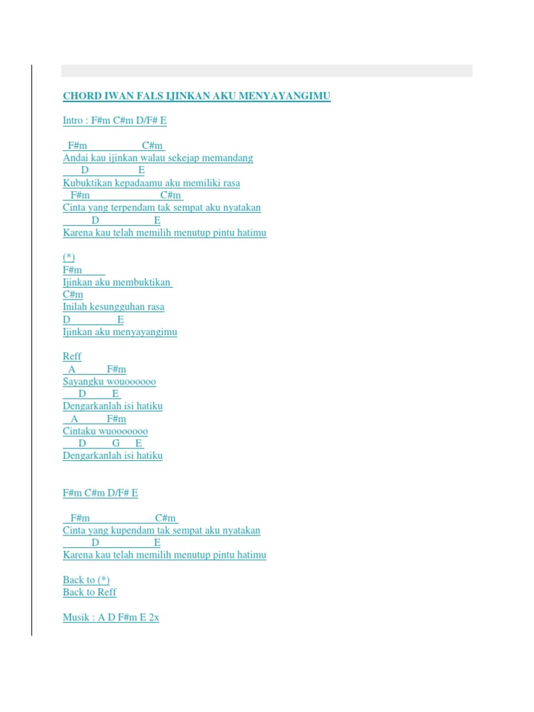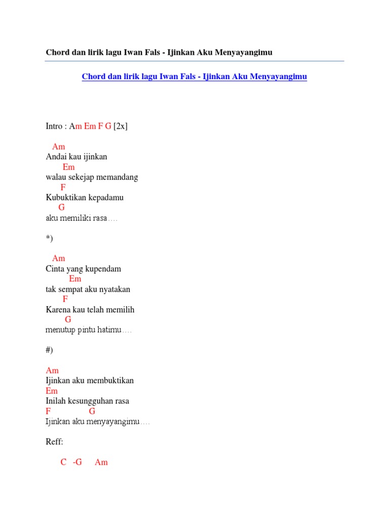 Intro Fm E Fm E Fm Cm Fm E Fm Cm Andai kau ijinkan walau sekejap memandang Fm E Kubuktikan kepadaamu aku memiliki rasa Fm Cm Cinta yang terpendam tak sempat aku nyatakan Fm E Karena kau telah memilih menutup pintu hatimu Fm Ijinkan. Chord Iwan Fals Ijinkan Aku Menyayangimu - Intro. 110894 views added to favorites 1422 times.